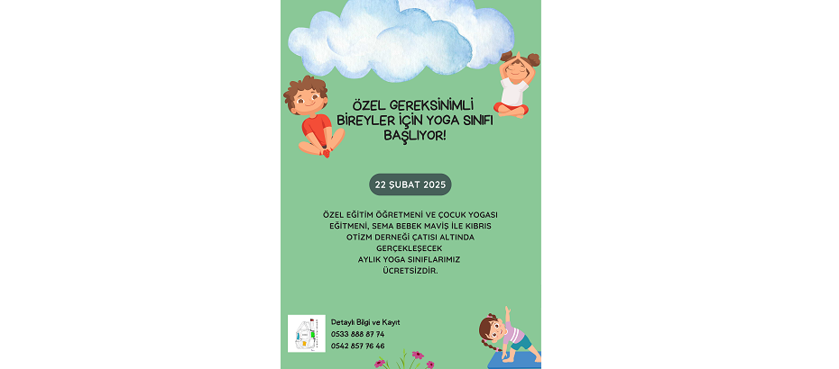 Kıbrıs Otizm Derneği, özel gereksinimli bireylerin bedensel ve ruhsal iyilik hallerini desteklemek amacıyla her ay ücretsiz çocuk yogası dersleri sunmaya başlayacağını duyurdu.