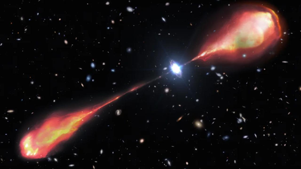 İki loblu radyo jetini oluşturan kuasar, evrenin henüz 1,2 milyar yıl yaşında olduğu dönemde meydana geldi.