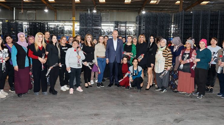 8 Mart Dünya Kadınlar Günü nedeniyle kadın çalışanlara çiçek takdim eden Cumhurbaşkanı Tatar, 2023 yılında yaşamını yitiren iş insanı Zafer Niyazi’nin portakal paketleme tesisinde açıklamalarda bulundu.