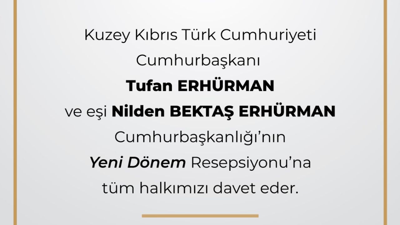 Cumhurbaşkanı Tufan Erhürman ve eşi Nilden Bektaş Erhürman, yarın Cumhurbaşkanlığı’nda Yeni Dönem Resepsiyonu düzenleyecek.