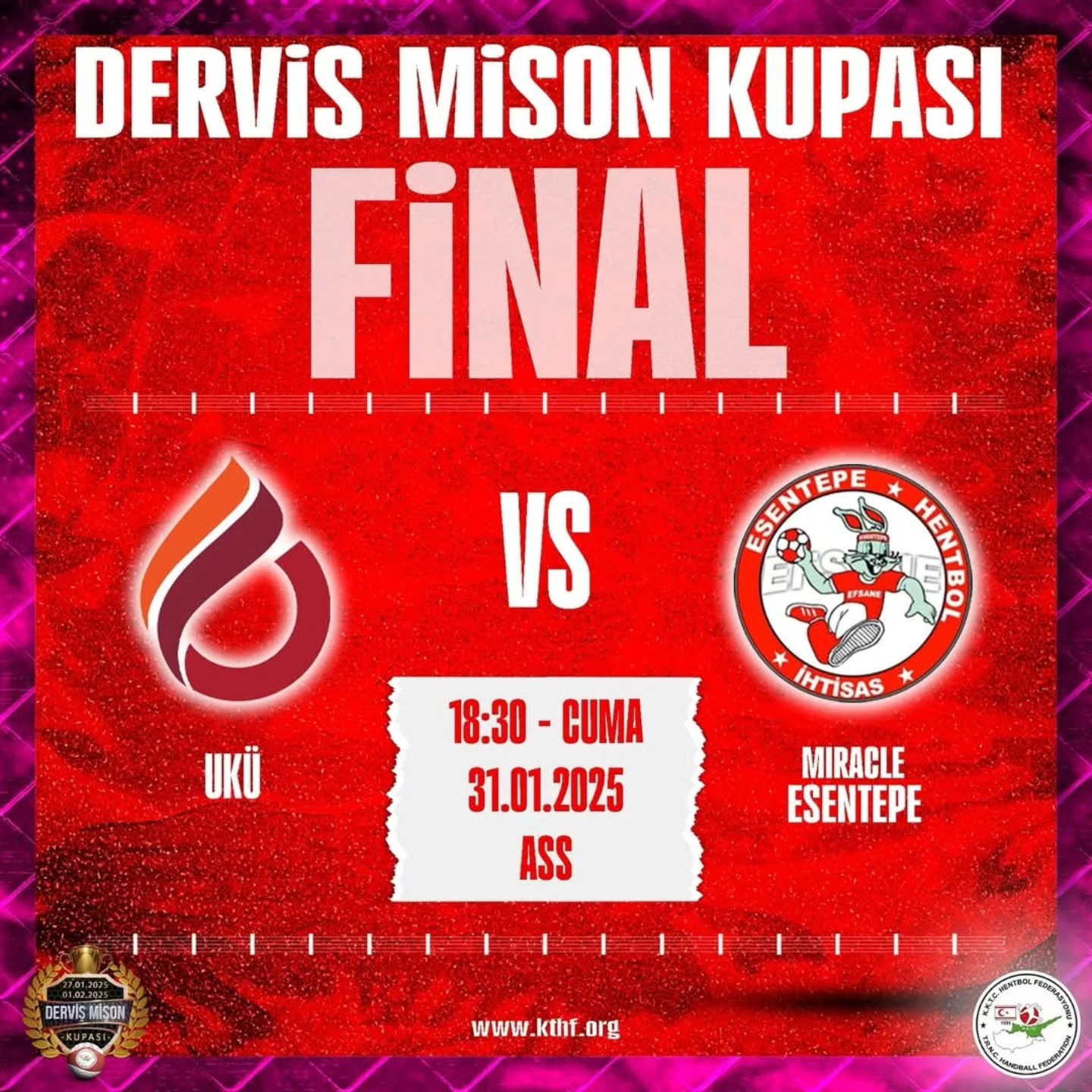 Hentbol Derviş MişonKupası’nınsahipleribuakşam belli olacak.LefkoşaAtatürk Spor Salonu’ndaoynanacak final mücadelesisaat18.30’dan itibarenbaşlayacak.İlk maçUluslararasıKıbrısÜniversitesi-Miracle Esentepekadıntakımlarıarasındaoyanacak.BukarşılaşmasonrasındaiseUluslararasıKıbrısÜniversitesiileGençlikGücüerkektakımlarışampiyonlukmücadelesineçıkacak.