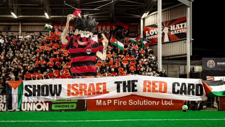 Soykırımcı İsrail’in Filistin’deki işgali ve Gazze ile Batı Şeria’daki saldırıları nedeniyle İskoçya ekibi Celtic’in ‘Yeşil Tugay’ taraftar grubunun başlattığı “İsrail’e kırmızı kart göster” çağrısına İrlanda’nın Bohemian takımı taraftarları da katıldı.