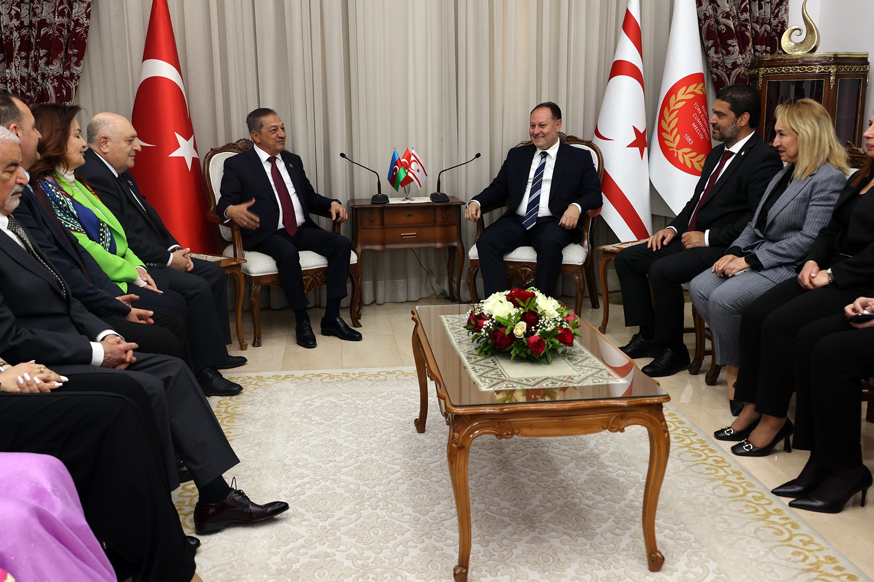 Heyet adına konuşan Cavanşir Feyziyev de, Kıbrıs Türk topraklarında bulunmaktan duyduğu memnuniyeti dile getirerek, “Buraya her defasında sevgi ve mutlulukla geliyoruz. Ancak bu binaya belki de son ziyaretimiz olacak, çünkü yeni bir meclis binasına taşınacağınızı öğrendik. İnşallah yeni binada da sizleri ziyaret eder ve bu önemli adımı tebrik ederiz.” dedi.